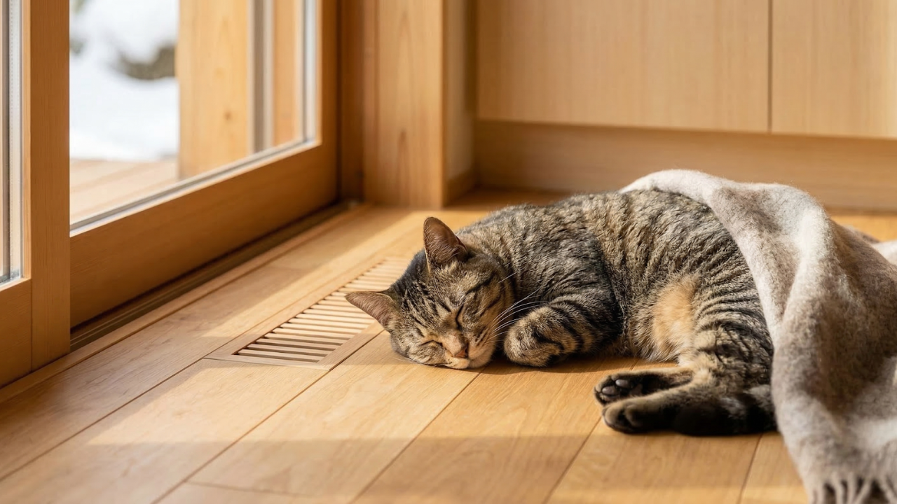 悠奏システムは基本的に「24時間つけっぱなし」で運用します。家全体の温度が常に一定に保たれるため、お留守番中の猫ちゃんやワンちゃんも、家中どこにいても快適。急激な温度変化による体調不良の心配も減らせます。