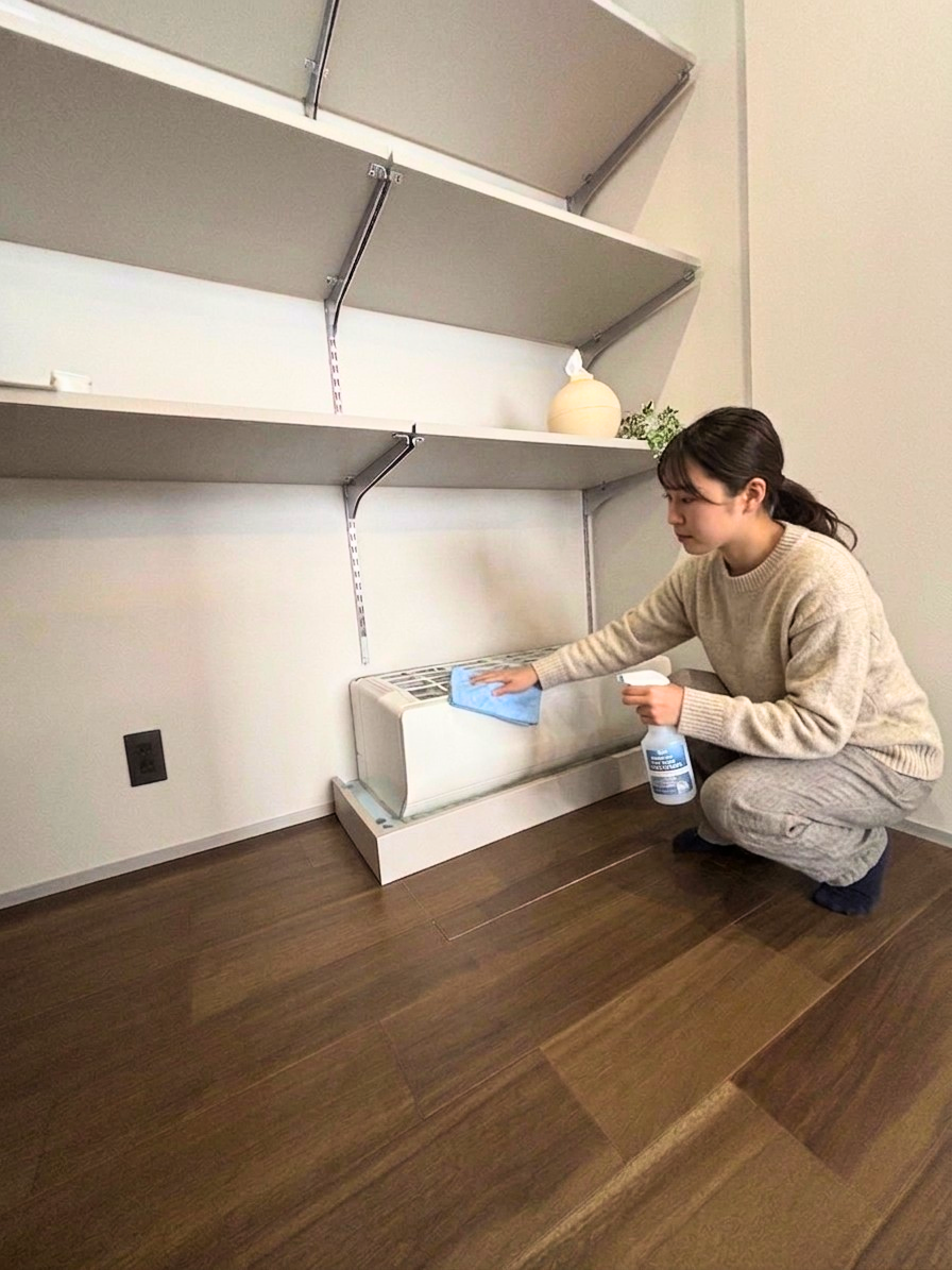 お手入れのメインは、通常のエアコンと同じ「フィルター掃除」です。壁掛けエアコンの場合は椅子や脚立に乗って高い場所を掃除する必要がありますが、悠奏システムは床上に設置されているため、腰を下ろすだけで簡単にフィルターを取り出せます。