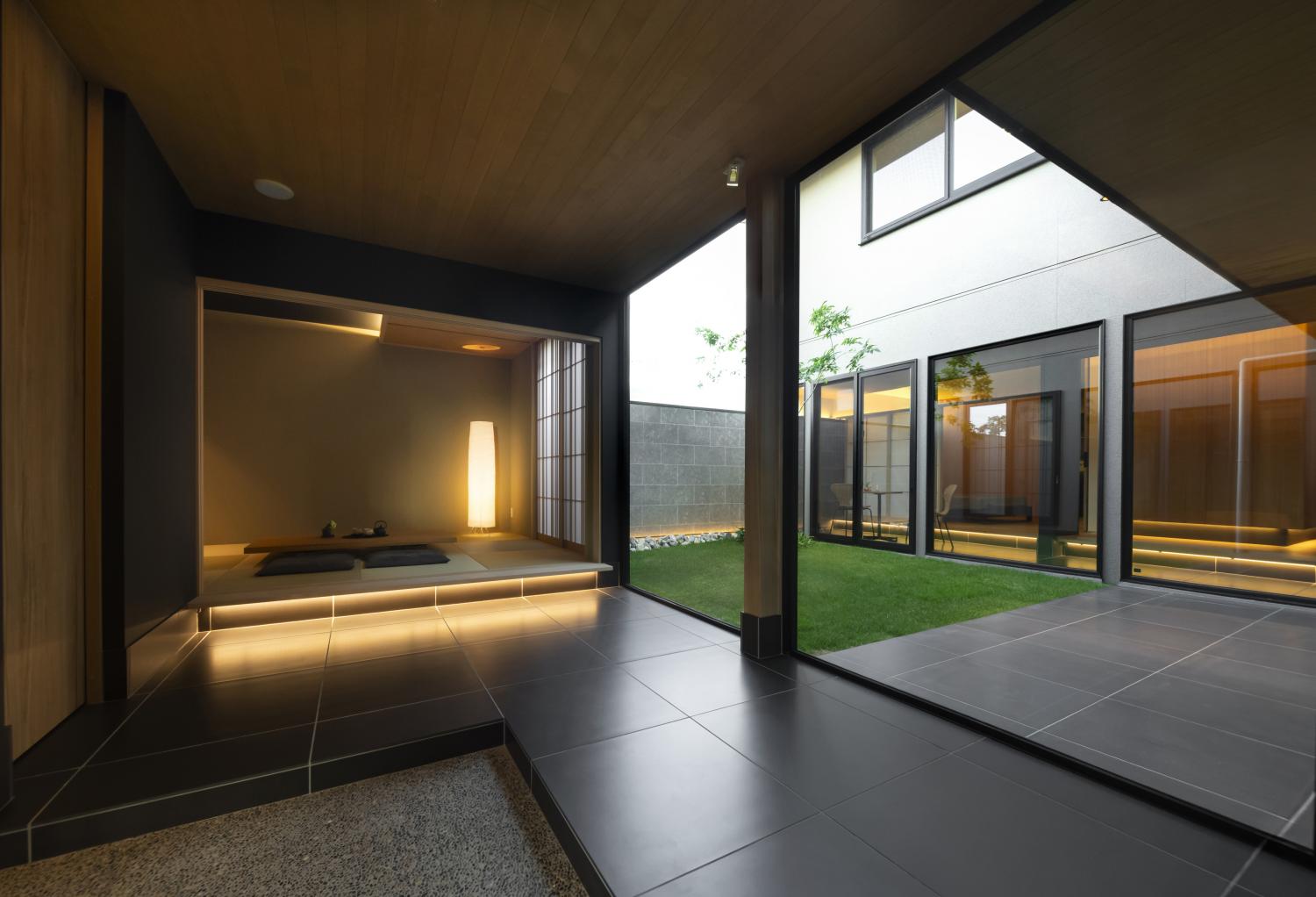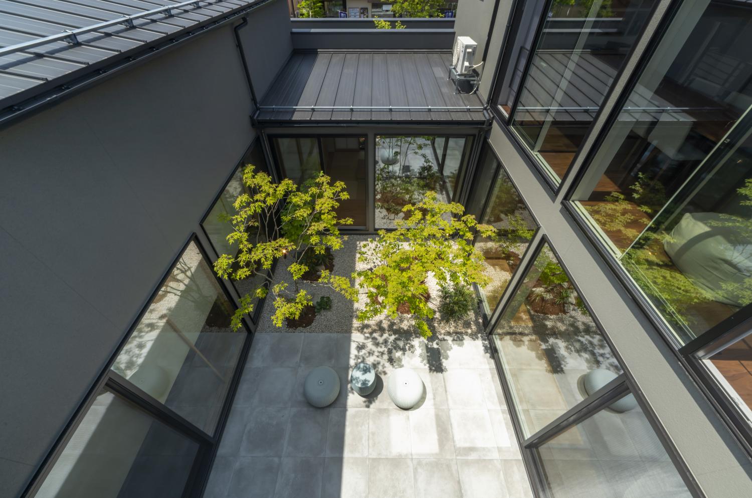 家のどこにいても、中心にある中庭から明るい光と緑を感じられる贅沢な間取りです。四方を壁や窓で囲んでいるため、道路や隣家からの視線は完全にシャットアウト。まさに「家の中にあるプライベートな外空間」です。