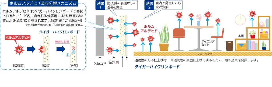 タイガーハイクリンボードは天井や壁下地に使えるせっこうボードで、化学物質”ホルムアルデヒド”を吸収・分解する性能をあわせ持っています。経年変化が少なく、強度の高い集成材を使用していても、タイガーハイクリンボードを使えば室内まで集成材ののりに使われている化学物質が漏れ出すのをほぼ防ぐことが可能です。