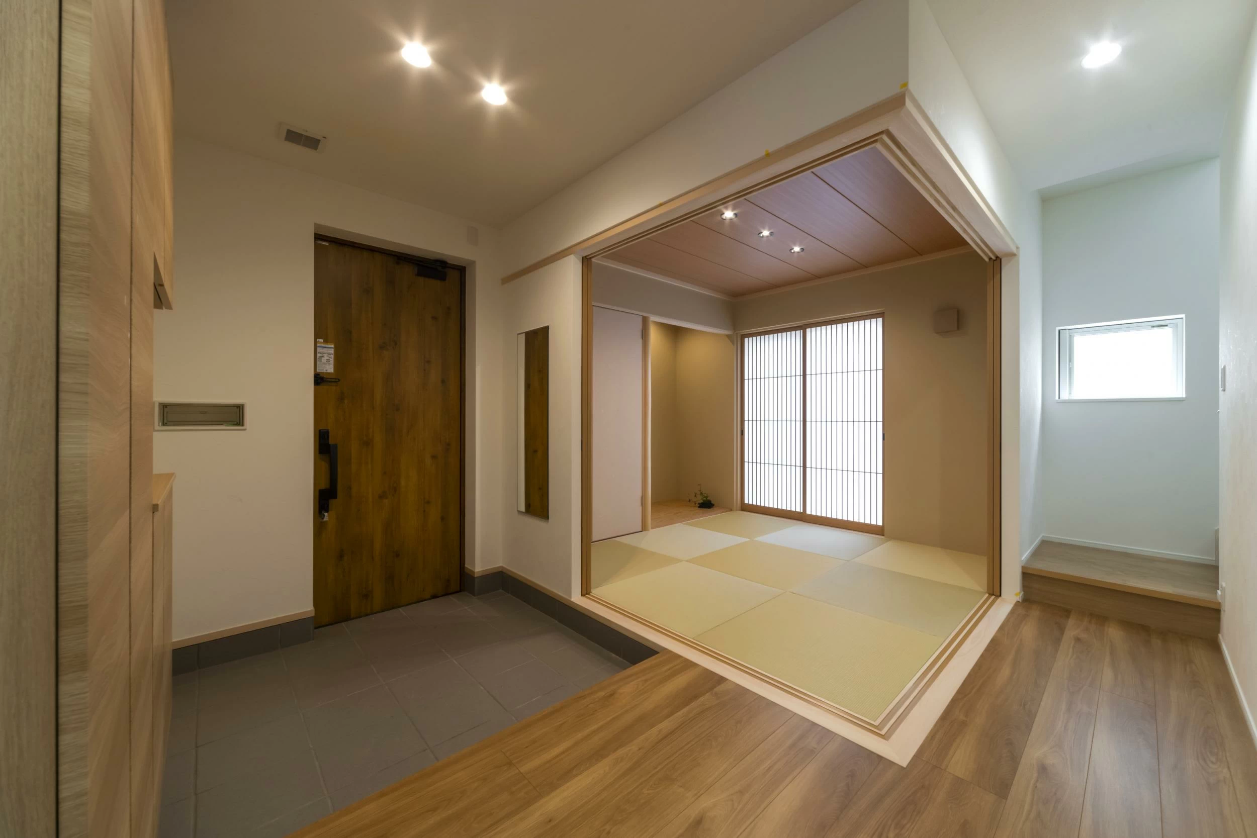大きなFIX窓がある和室、窓の向こうは囲い庭