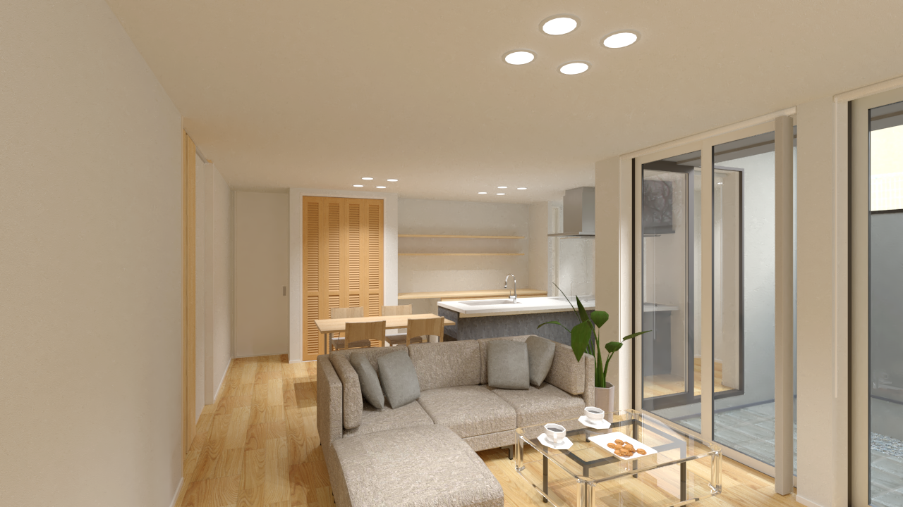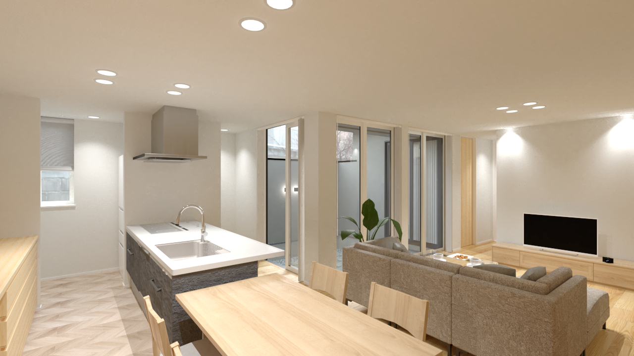 囲い庭から自然光をたっぷりと心地よく受け止めつつ、LDKをより広く・開放的に見せてくれます。