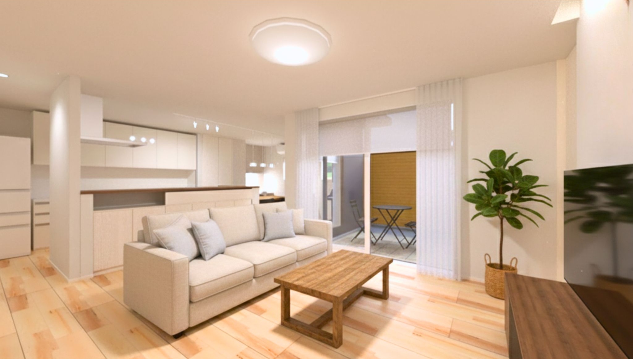 22.8帖のLDKは、中庭とつながることで、より広く、開放的に感じられる空間です。