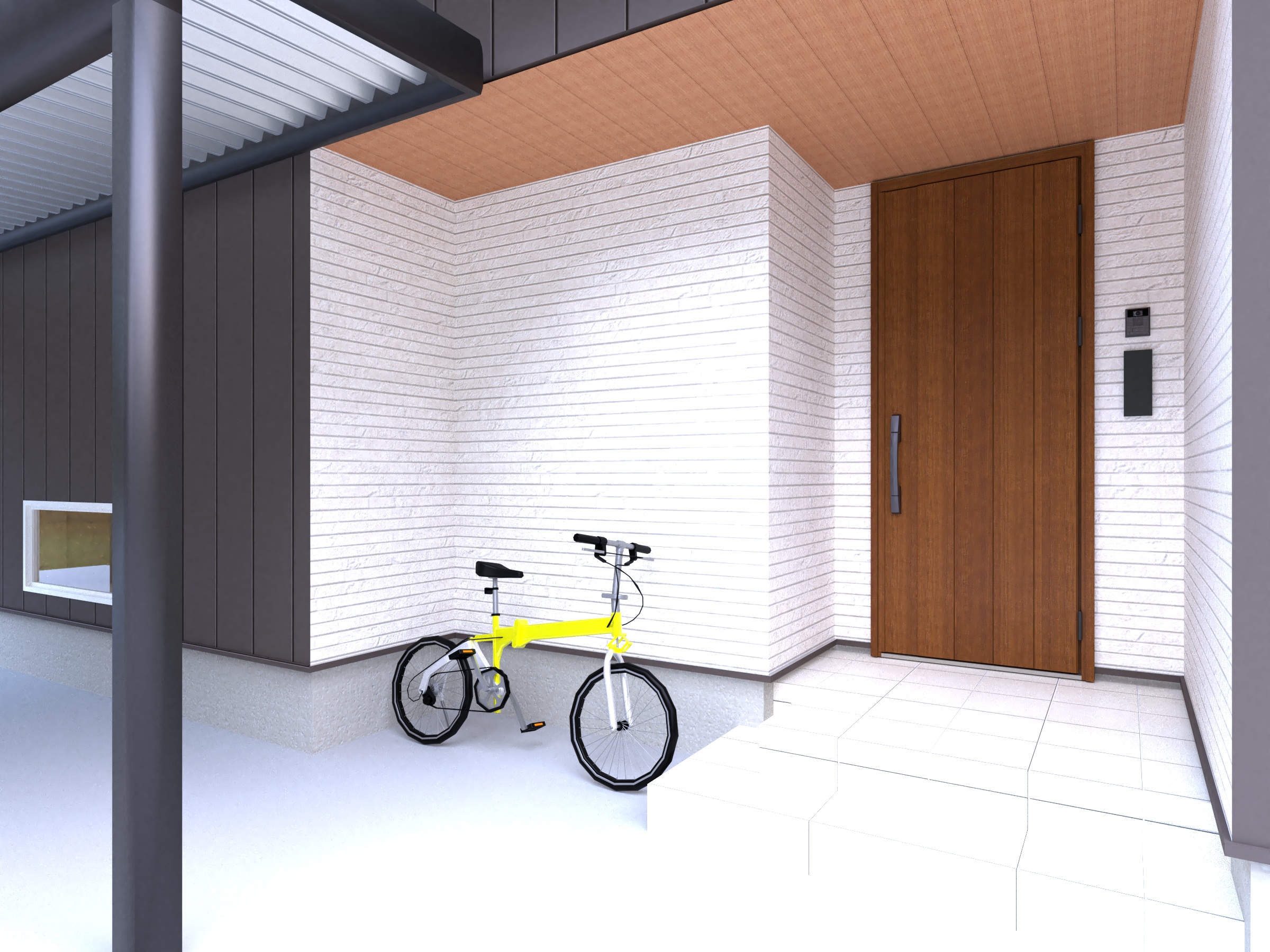 玄関横には、自転車を雨にさらさず置けるスペースを設け、日々の使いやすさにも配慮。