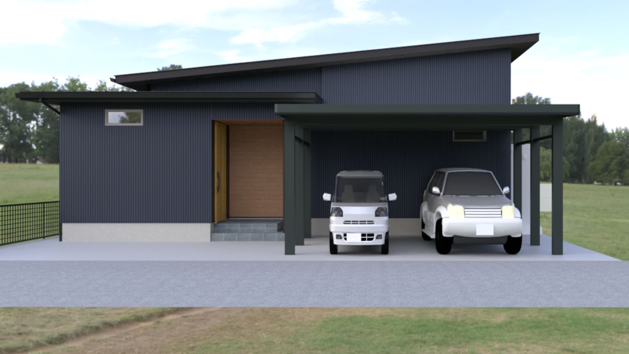 カーポートから玄関まで屋根がつながり、雨や雪の日でも濡れずに出入りできるアプローチ。