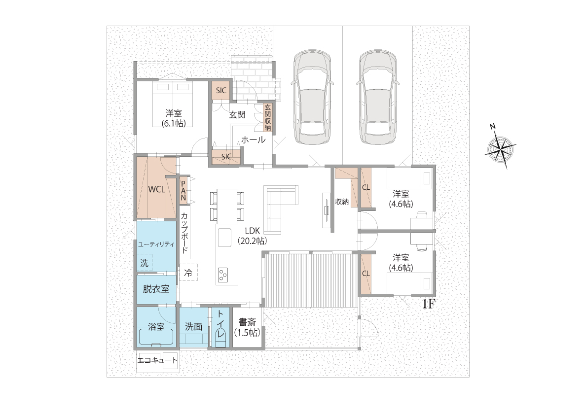 - LDKを中心に、水回りや収納へつながる回遊動線で、家事・移動の負担を軽減