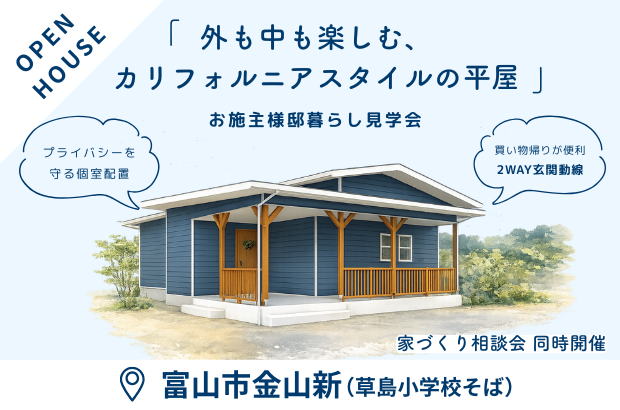 【5/23(土)・24(日)|限定公開】富山市金山新 「外も中も楽しむ、カリフォルニアスタイルの平屋」完成見学会