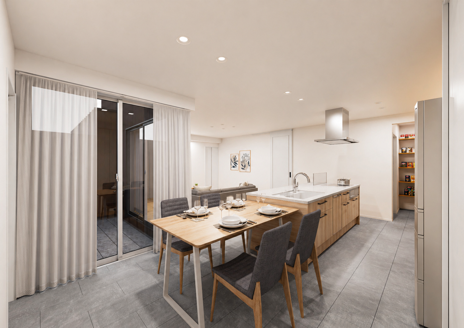 キッチン横にはパントリーを設け、家事効率と収納力のバランスにも配慮しています。