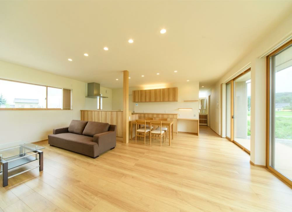 緑溢れる田園と壮大な山並みが目の前に広がるこちらの住まい。LDKの大きな窓から見える景色は、空まで切り取ったかのように爽快でダイナミック。何気ない生活の中で季節のうつろいを楽しむことができます。これだけ大きな窓にしてもほとんどエアコンをつけずに過ごせるのは外断熱のおかげ。冬暖かく、夏涼しい快適さは、確かな高気密・高断熱性能の証です。