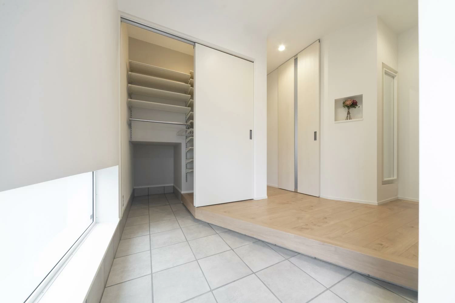 地窓のある明るい玄関ホールは右にトイレ、左に寝室、正面はリビングへとつながります。