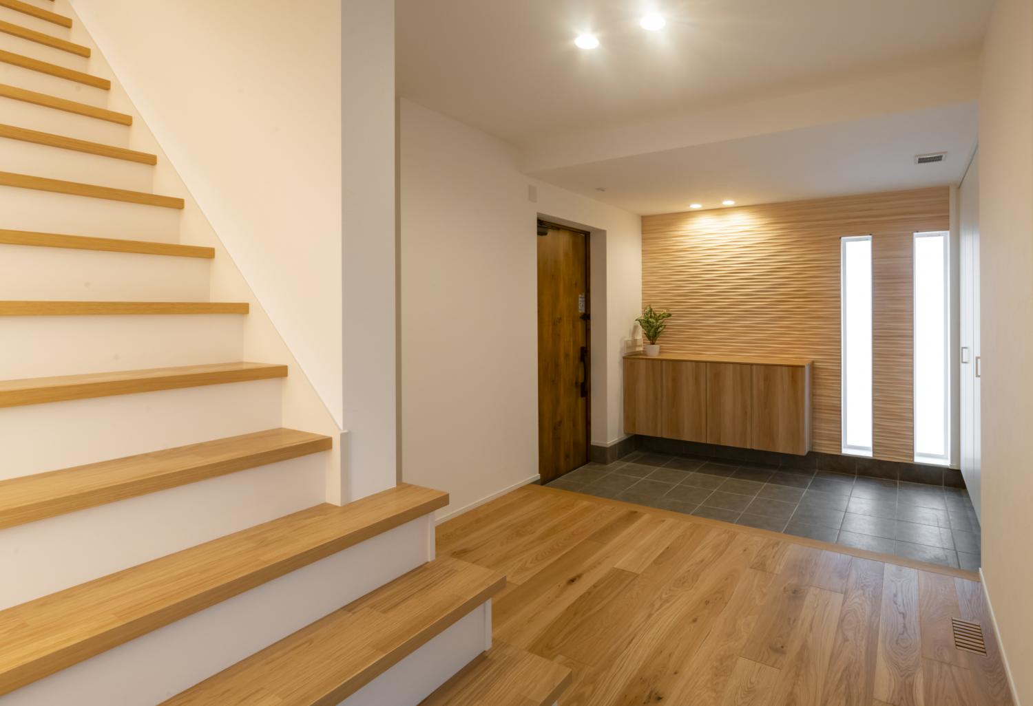 1階の床材は、オーク材の挽板フローリングを採用。 無垢の風合いを重視しつつも、反りに強いという耐久性の高さから採用を決められました。